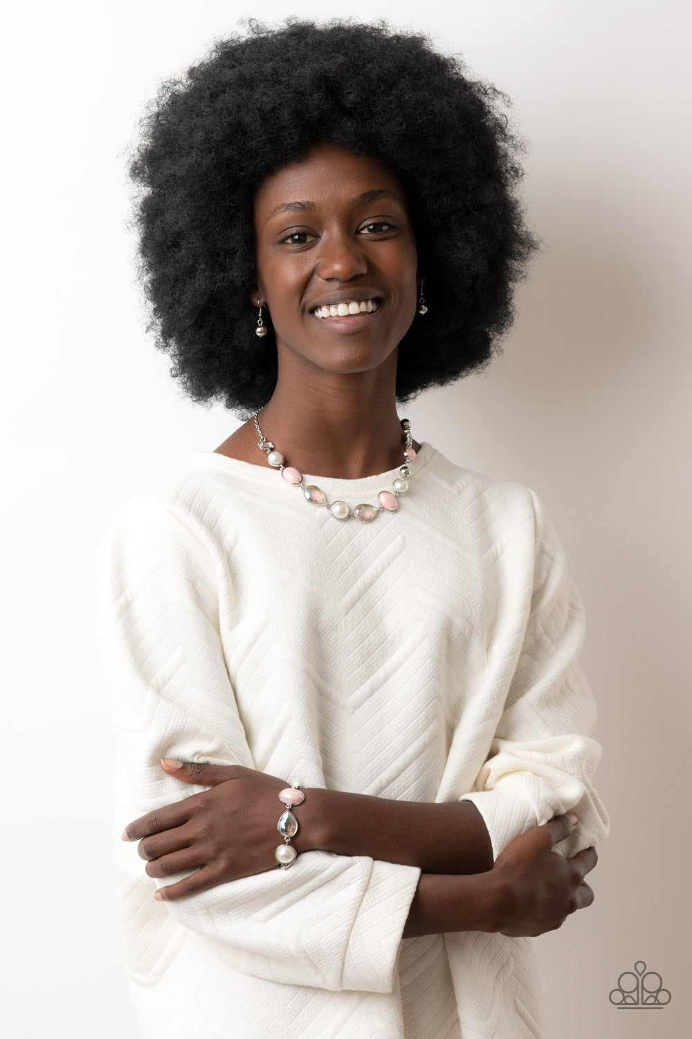 A collection of classic white pearls, iridescent Pale Rosette beads, white emerald cut gems, and iridescent crystal-like teardrops dance below the collar for an ethereal display. Shiny silver frames encase each bead, adding a romantic vibe to the vintage inspired design. Features an adjustable clasp closure.